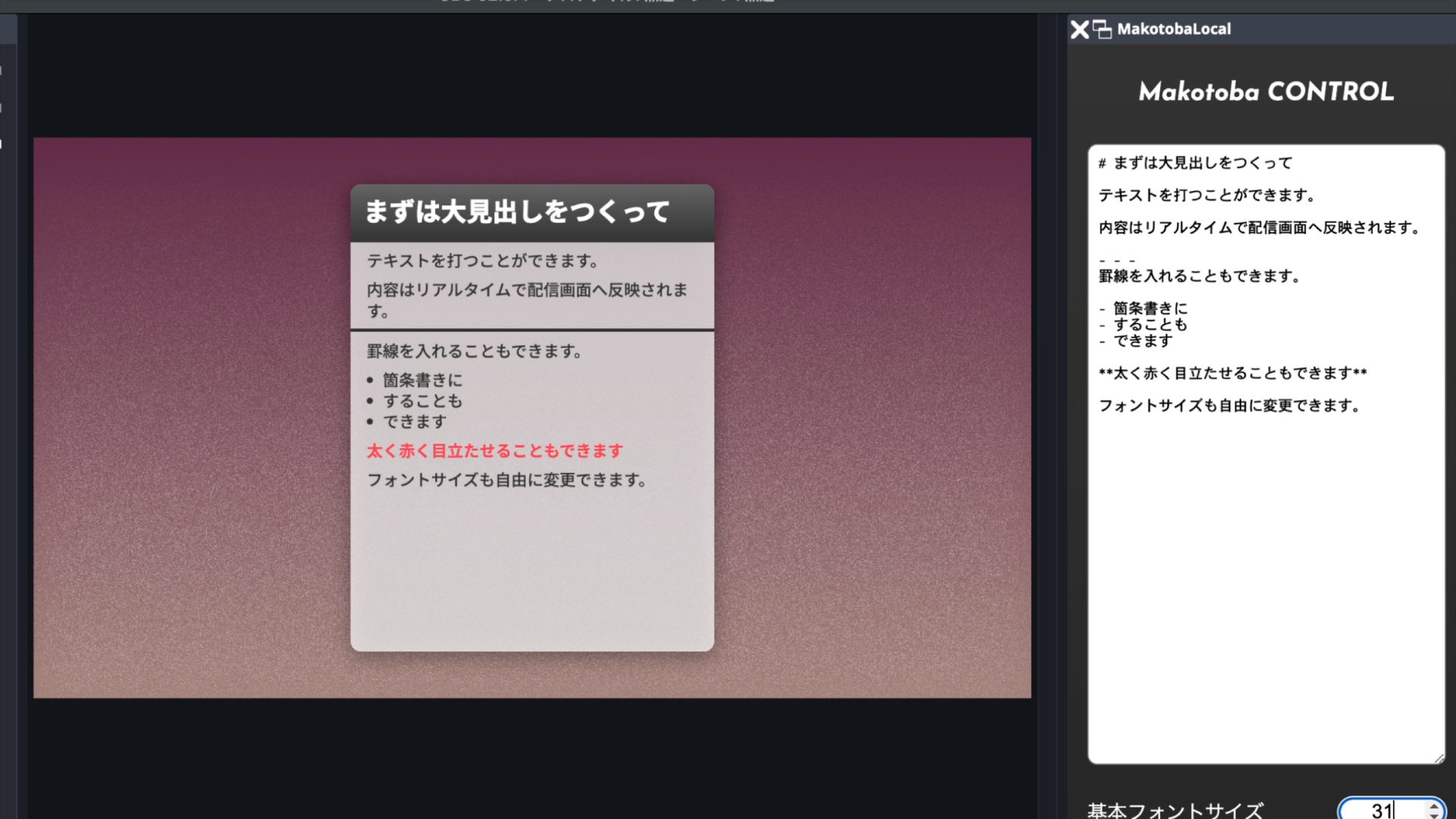 使い方OBS上部バーの「ドック」→「カスタムブラウザドック」を選択。ドック名にてきとうな名前、URLに下記を入力し、「閉じる」を押す。Control改めてOB...